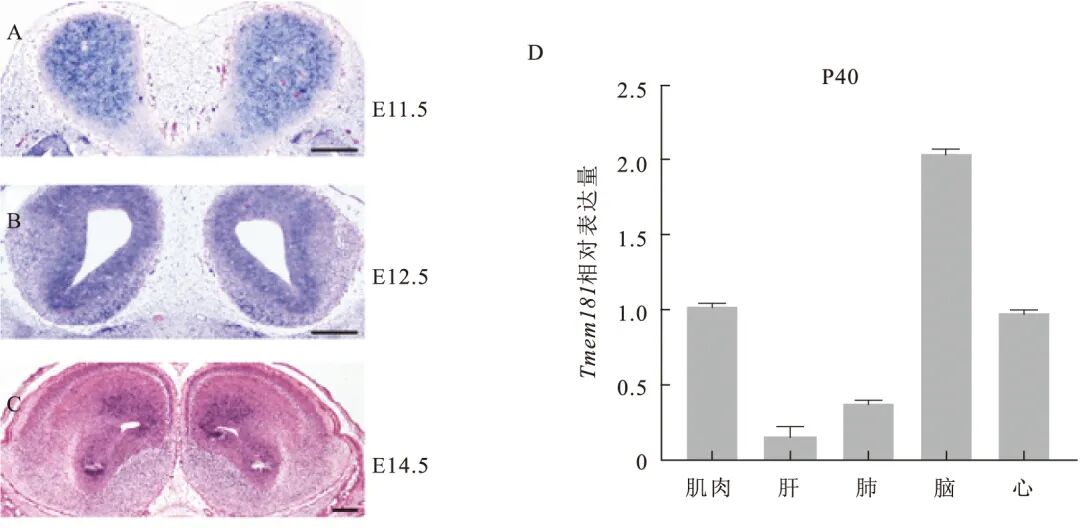 探针信号为紫色;A—C:小鼠胚胎脑部组织Tmem181原位杂交结果;D:P40小鼠组织Tmem181定量表达结果;比例尺:200μm.