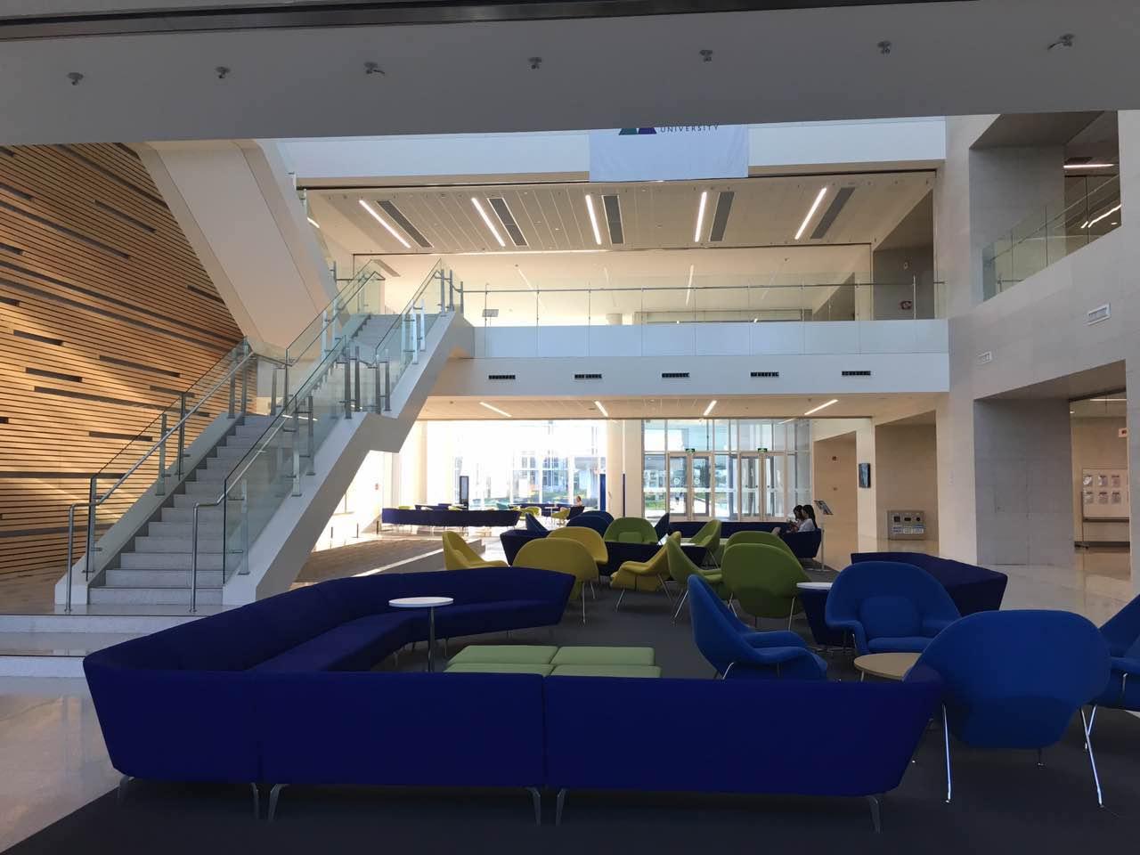 文中说到优越的物质条件,真的是非常优越……就不说第一周破冰的时候举办的活动学校有多土豪了,抽个奖奖品都是iPad,票圈被刷屏…学生宿舍完全五星级宾馆标准(人均52平),四人共用一个客厅,学校组织出去玩不需要自己掏钱,24小时可供使用的散布在学校各处的免费打印机,两层楼的开到晚上12点的免费健身房,全部采用落地窗设计的建筑,一共就两层楼的宿舍有大电梯,教室五个大屏幕,弧形设计,校车免费接送服务。学校土豪并不意味着高昂的费用,学费24400元/学期,来这里的大部分有全奖(不需学费)或者半奖(12200元/学期),住宿费6000(双人间),8000(单人间),除此之外不需要任何费用,学校承担保险费。虽然住宿费略贵但真的是五星级的环境啊……觉得学校收费只是象征性的收一收,在我们身上的投入完全超出了这个价钱。我拿到了全奖,只交了6000,真的是赚啊!落地窗超级美啊!连其中一个食堂都是落地窗TAT胃口都变好了哈哈哈哈哈。