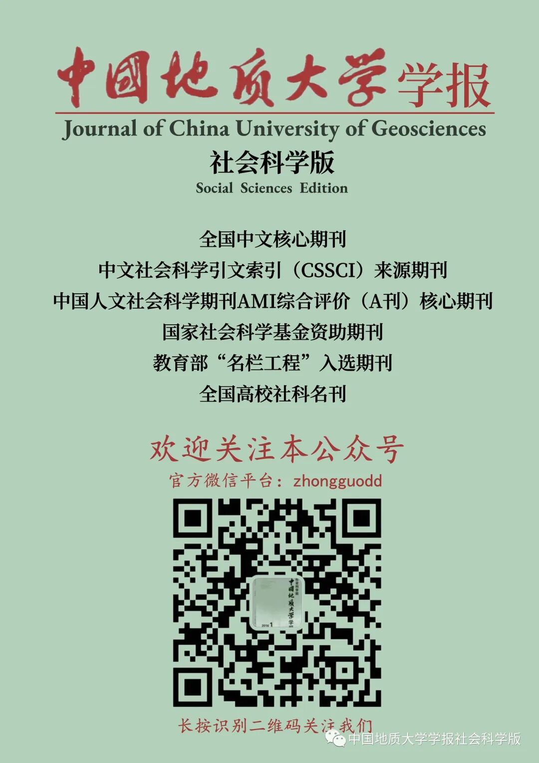 《中国地质大学学报(社会科学版)》是教育部主管、中国地质大学(武汉)主办的社会科学综合性学术刊物,为国家社会科学基金资助期刊、中文社会科学引文索引( CSSCI)来源期刊、全国中文核心期刊、中国人文社会科学核心期刊。根据《中国学术期刊影响因子年报(人文社会科学)》2021版,本刊复合影响因子3.989,位于Q1区。 本刊常设栏目有资源环境研究(教育部名栏,下设“资源环境经济与管理”和“环境资源法”两个子栏目)、马克思主义研究、新闻与传播、管理与经济等,同时不定期推出高等教育、生态哲学等栏目。