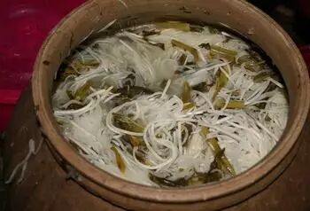 富源酸菜,观其色,绿白相间;察其形,粘稠滑腻;品其味,则酸纯无比。最有代表性的吃法是红豆酸菜汤,熬得烂熟的红豆和着酸菜一起煮,吃时放点煳辣椒面和盐,轻软爽口。配与火腿、猪脚、鸡或鱼等肉类食品加上酸菜一起煮,又成了独具特色的风味菜。香喷喷端上来一大锅,人们净爱拣那酸菜吃,这时候鸡呀鱼呀倒成点缀了。这时,你小酌一口汤,酸中带鲜,浓而不腻,酸鲜可口,回味无穷。