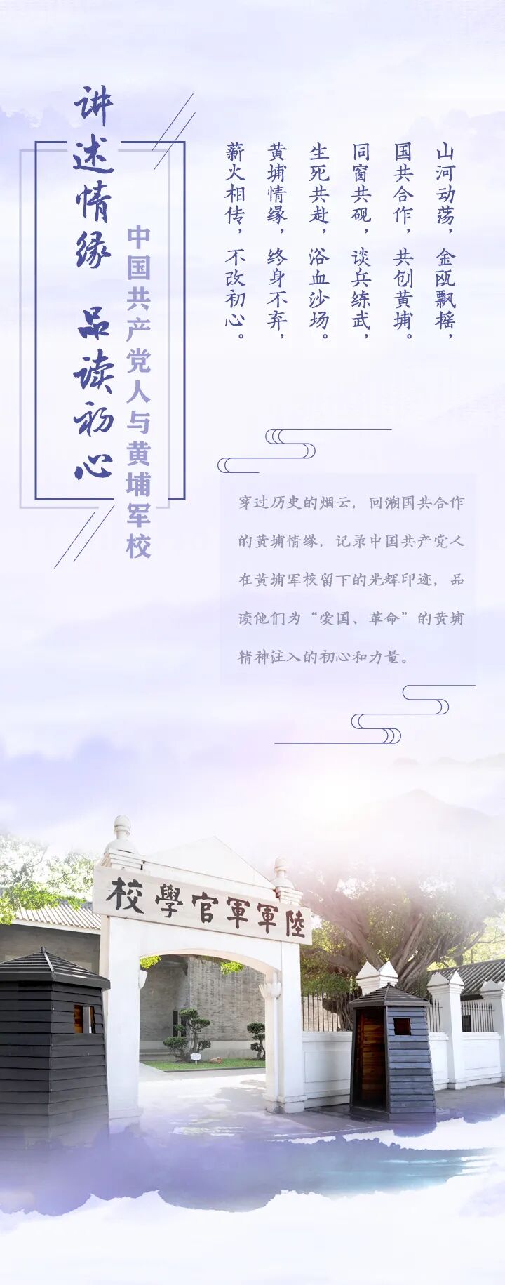 今年是中国共产党成立100周年。为进一步推动中共党史学习教育,传承建党精神,赓续红色基因,弘扬黄埔精神,坚守爱国初心,深切感悟中国共产党苦难与辉煌交织的百年奋斗史,从党史中感悟共产党人的初心和使命、汲取前行的力量,以高度的历史自觉和深沉的爱国情感,凝聚起爱国奉献的强大力量,浦江和声微信公众号近期推出“讲述情缘 品读初心”——中国共产党人与黄埔军校主题专栏。