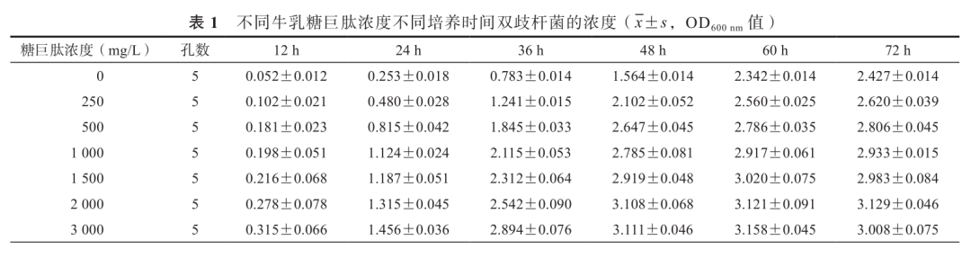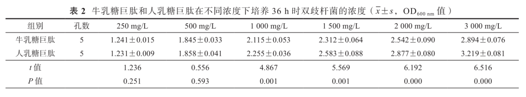 培养36 h时,培养基中糖巨肽浓度为1 000、1 500、2 000和3 000 mg/L时,人乳糖巨肽促进双歧杆菌增殖的效应更强,差异均有统计学意义(P值均<0.01)。见表2。
