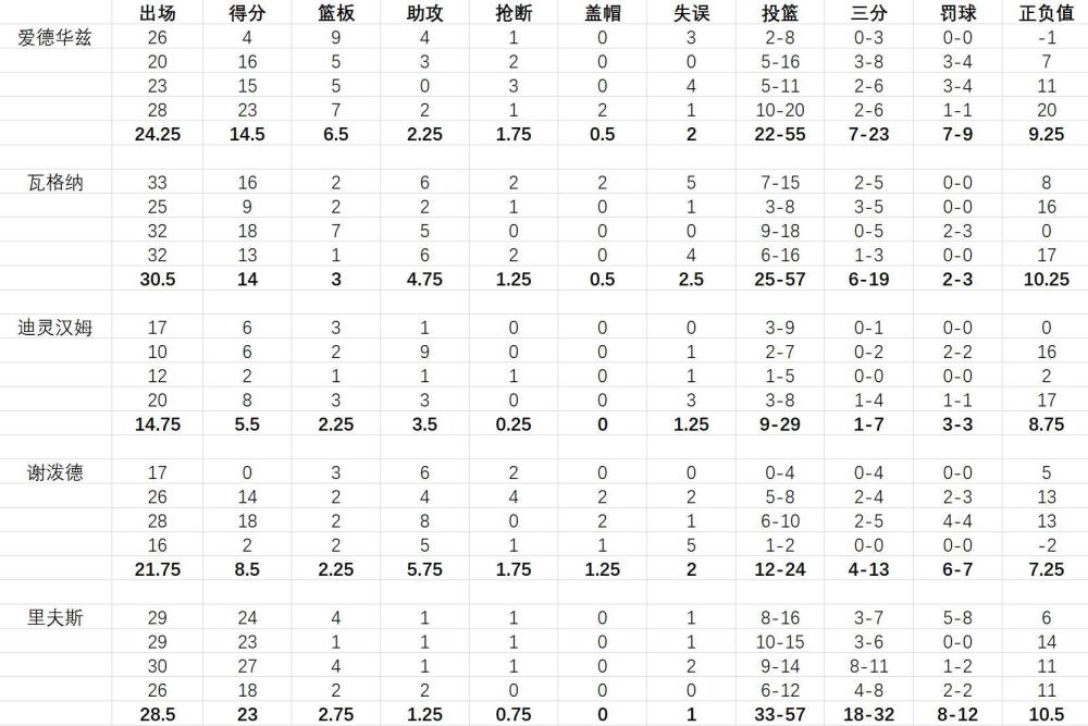 爱德华兹场均24.25分钟得14.5分6.5篮板2.25助攻1.75抢断2失误,三项命中率40%、30.4%、77.8%;