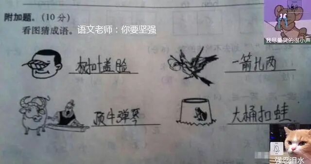 ?这位小学生请认真一点,虽然是附加题,但也是算分的呀!题目是看图猜成语,这个树叶挡脸、顶牛弹琴还算能接受。