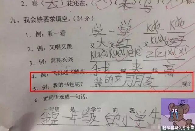让孩子做试卷的目的就是检验孩子的知识是否学会,是否学以致用。当孩子还没将知识学扎实牢固,那自然就写出了令人哭笑不得的答案了。