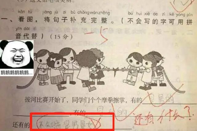 ?这位小学生的脑回路真是让人摸不着头脑,题目内容是小朋友们在进行拔河比赛,让孩子根据图片,将句子补充完整。