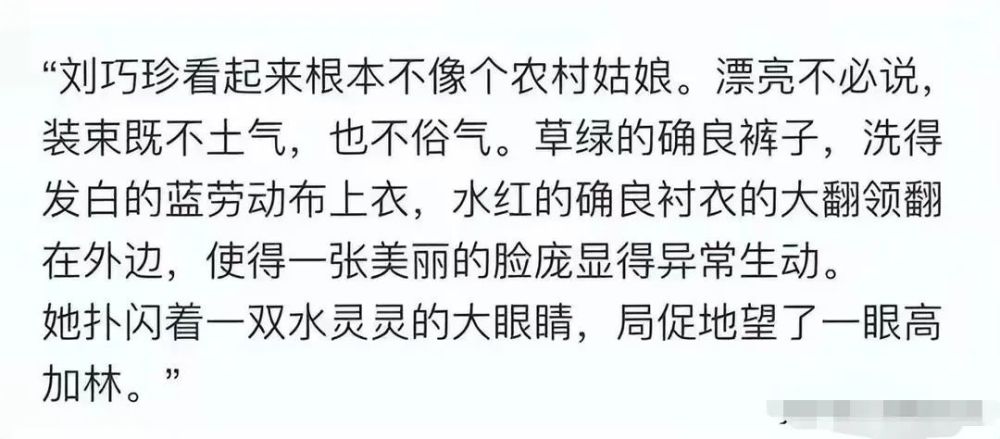 原著中的刘巧珍是漂亮向上的,她永远充满着乐观精神,而李沁饰演的村花就有点不尽人意了,她在外形上为了贴黑角色,故意抹黑了全脸,这样黝黑的皮肤再加上那个她瘦弱的身材,让人觉得有些营养不良。