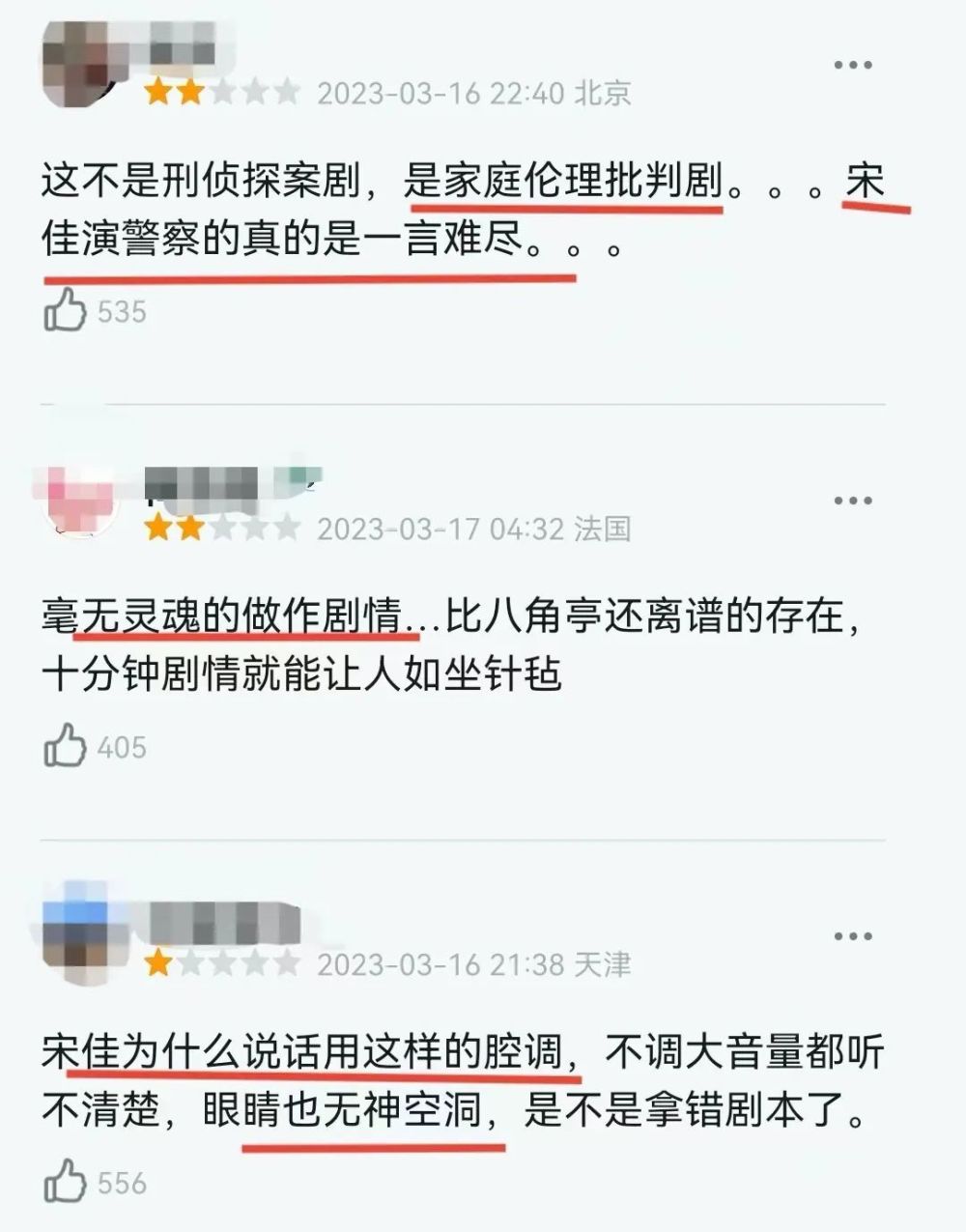 宋佳作为女主饰演的是刑警冉咚咚,剧情以她和专案组的成员一起侦破凶杀案为主线,以她和丈夫的夫妻生活为副线,本来双线并行很有看头,但实际上这是一部披着刑侦外壳的家庭伦理剧,而宋佳在里面的表现也备受吐槽。