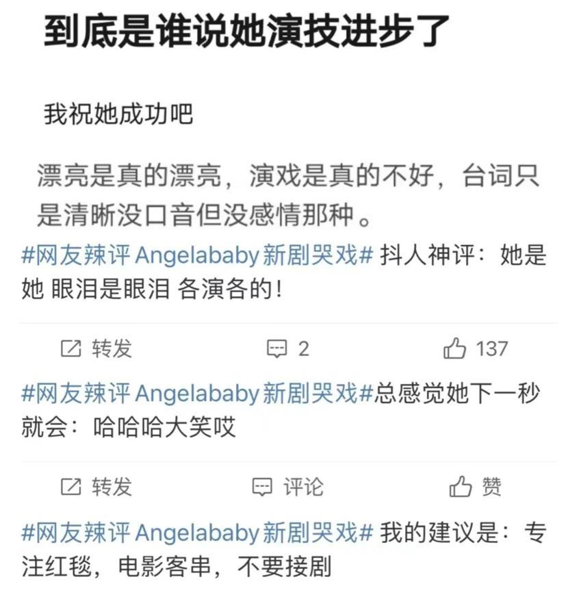 虽然说观众最开始就不是很期待这部剧,但没想到最后被震惊的还是杨颖的演技,有网友表示“能够差到这种程度也不容易了”“好在杨颖有美貌,否则连花瓶都当不上了”。