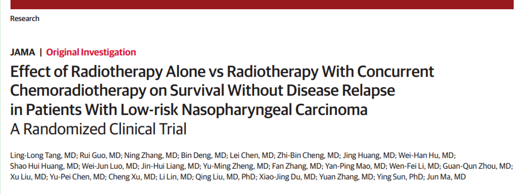 该研究为中山大学肿瘤防治中心马骏教授、孙颖教授领衔开展的一项III期随机临床研究,发表于2022年8月的《美国医学会杂志》(JAMA),旨在探索对于低风险鼻咽癌患者,单独进行调强放射治疗(IMRT)是否不劣于同期放化疗?研究背景