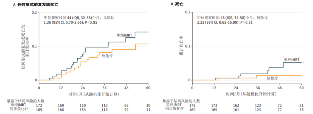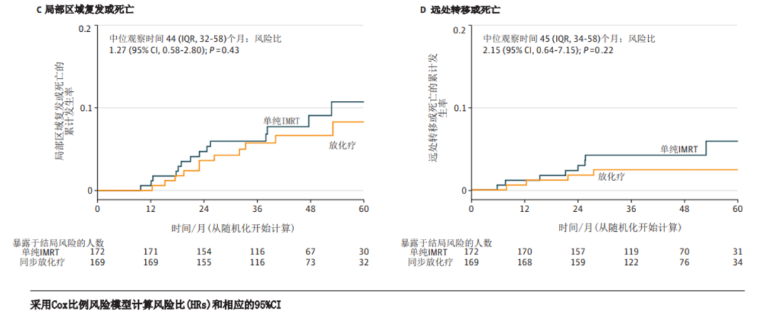 中位随访时间46个月(IQR,34-58个月),共24例患者出现局部区域失败(单纯放疗组13例,同步放化疗组11例,P=0.71),12例患者出现远处转移(单纯放疗组8例,同步放化疗组4例,P=0.25)。