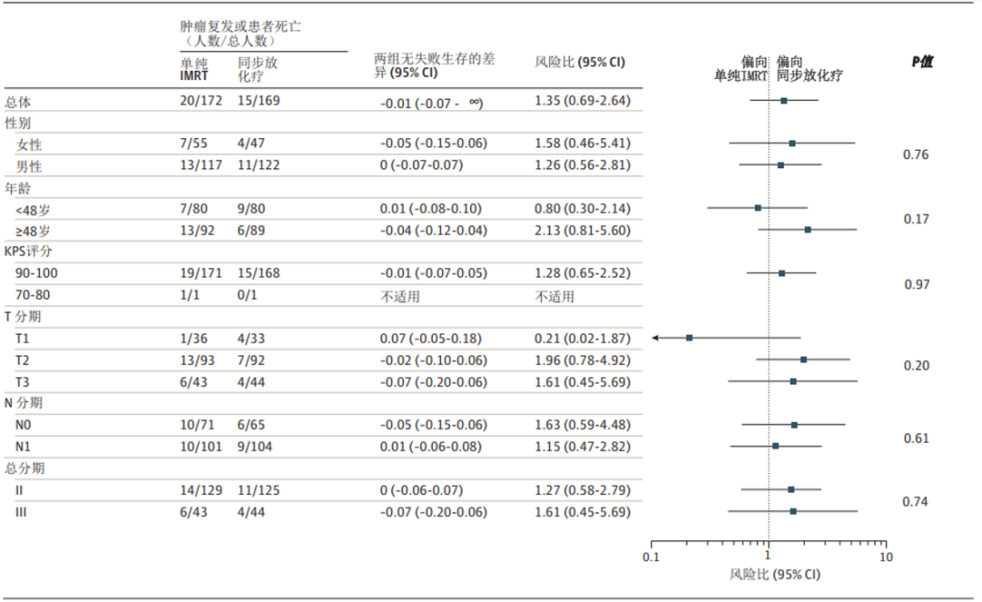 亚组分析的结果显示,各亚组的无失败生存率无显著差异,且多因素分析结果也显示同步化疗并非患者的独立预后因素(图2)。