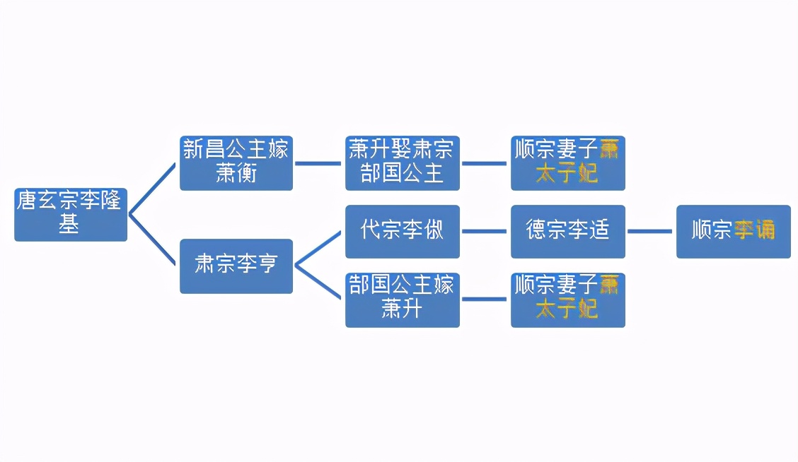 唐顺宗李诵和原配妻子太子妃萧氏,也是姑侄婚。太子妃萧氏的母亲、风流的郜国公主,是肃宗李亨的闺女,即代宗李俶的妹妹,德宗李适的姑姑,顺宗李诵的姑祖母。