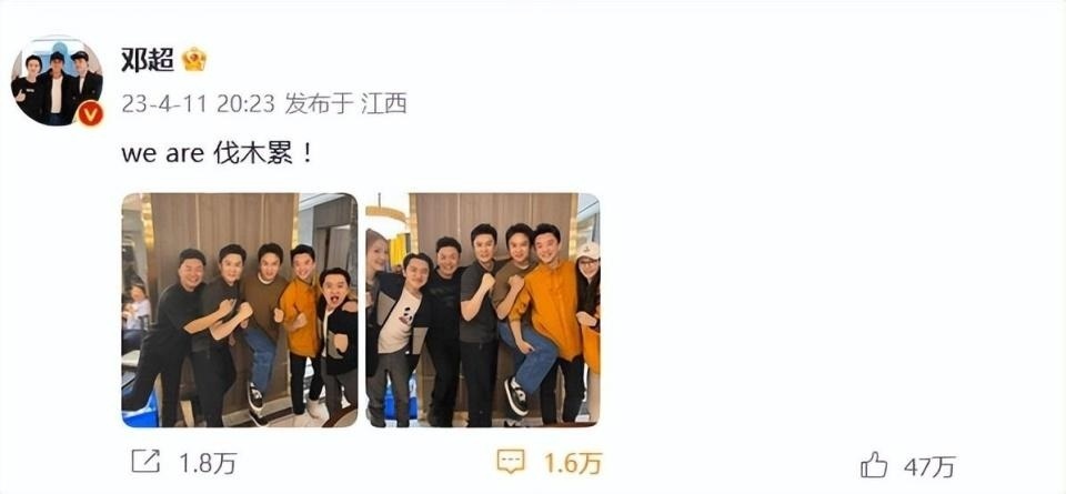 他晒出照片再喊当年在《奔跑吧》里的经典口号:“we are 伐木累 ! ”