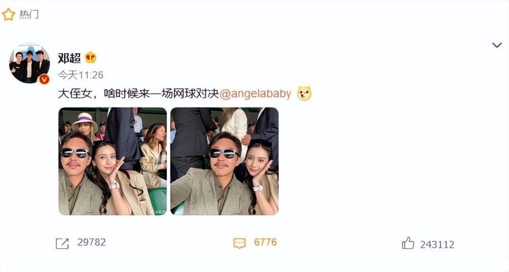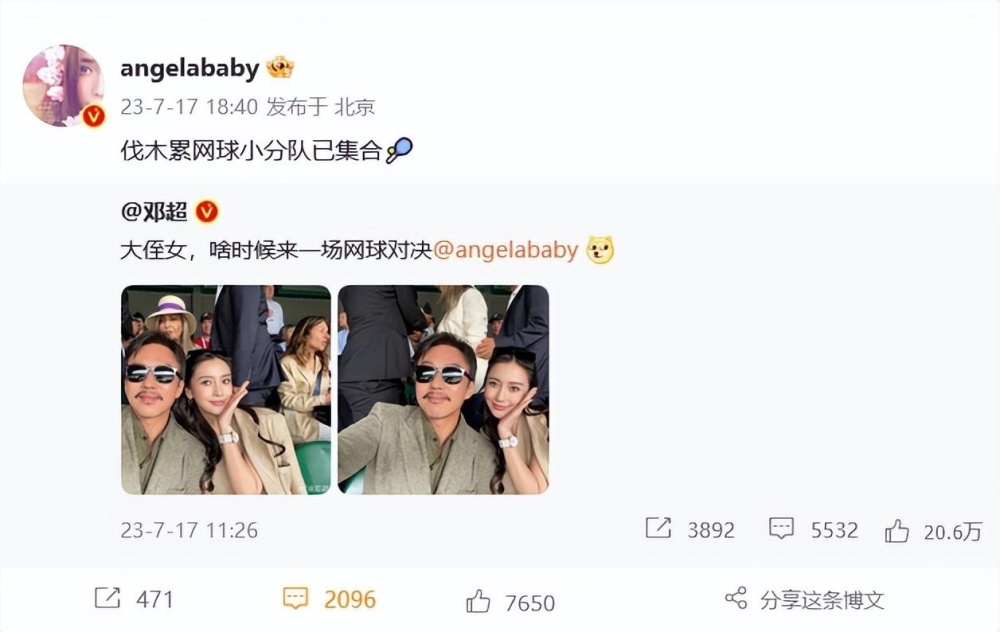 稍晚,baby转发邓超的这组合照回应:“伐木累网球小分队已集合。”