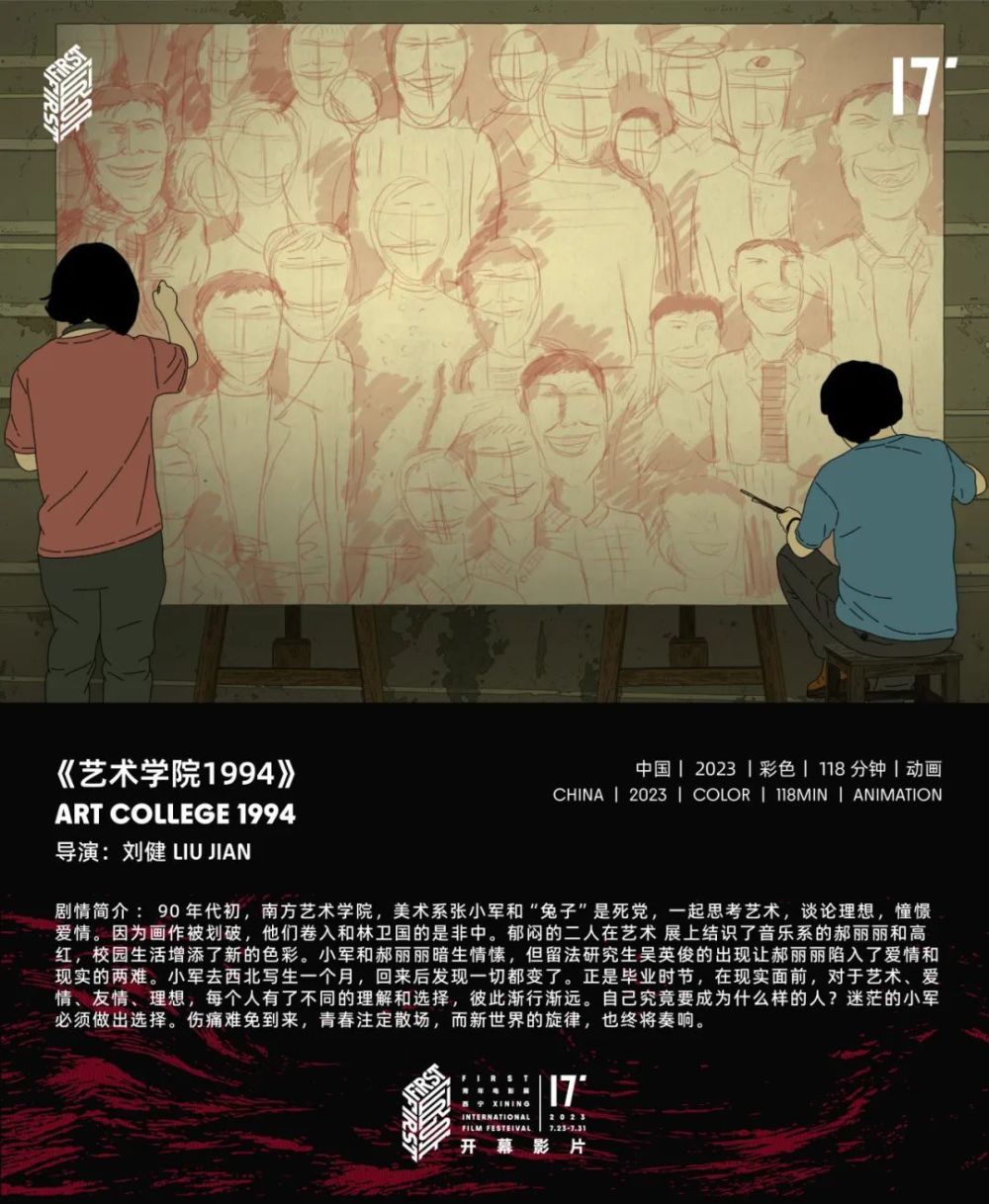 第十七届FIRST青年电影展开闭幕影片今日揭晓。开幕影片为刘健创作,董子健、周冬雨、仁科、PAPI、黄渤、大鹏等声音出演的动画长片《艺术学院1994》(原名《艺术学院》)。在刘健这里,动画语言冲破了架空之笼、奇观之锁,获得映照现实、接纳日常和表达艺术家自我的自由。影片用风格化的手绘笔触和舒缓的节奏生动地呈现出日常生活的细节,幽默而机敏的对白描绘了一代艺术青年的真实状态与那些跨越年代的、永恒的“青春问题”。