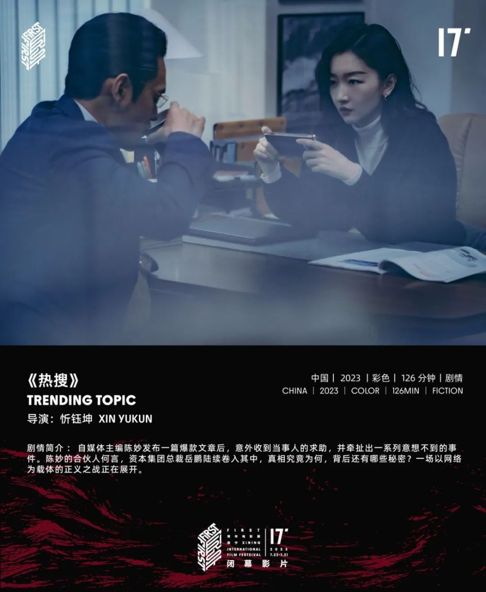 延续了往届FIRST闭幕影片中对现实题材作品的忠实,本届闭幕影片确定为忻钰坤执导,周冬雨、宋洋、袁弘领衔主演的影片《热搜》,讲述了在这个人们通过手机屏幕和社交网络“接入”世界的时代,几名新媒体行业的弄潮儿所经历的关于抉择与守护、真相与正义的故事。