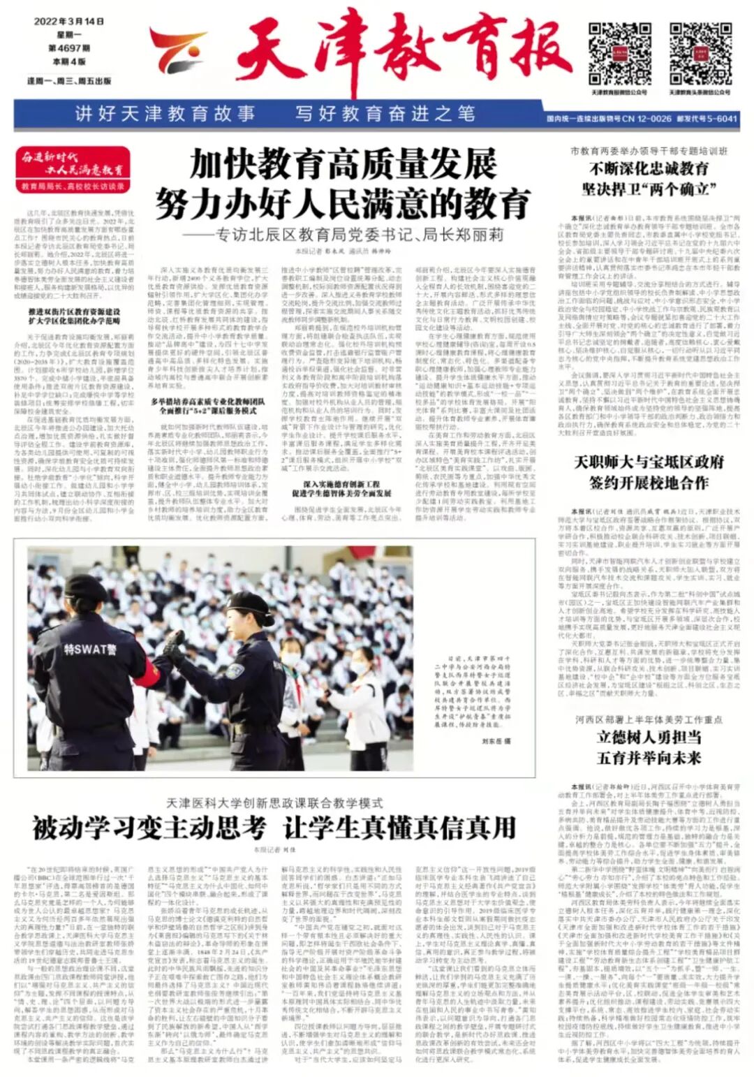 这几年,北辰区教育快速发展,凭借优质教育吸引了众多关注目光。2022年,北辰区在加快教育高质量发展方面有哪些重点工作?围绕市民关心的教育热点,日前本报记者专访北辰区教育局党委书记、局长郑丽莉。她介绍,2022年,北辰区将进一步落实立德树人根本任务,加快教育高质量发展,努力办好人民满意的教育,着力培养德智体美劳全面发展的社会主义建设者和接班人,服务构建新发展格局,以优异的成绩迎接党的二十大胜利召开。