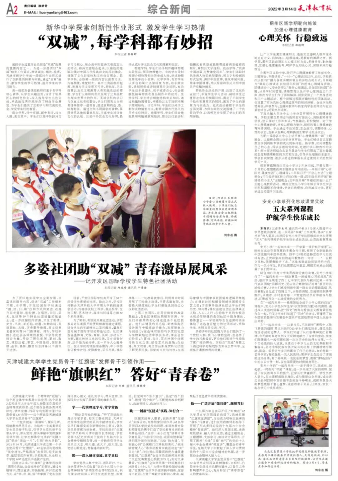 本报讯(记者彭未风 通讯员叶秋立)为深入推进中小学思想政治教育,进一步巩固“双减”工作成果,落实“五育并举”育人要求,北辰区安光小学开学初积极组织学生开展“五大”系列课程护航学生快乐成长活动,让思政教育落地生花。