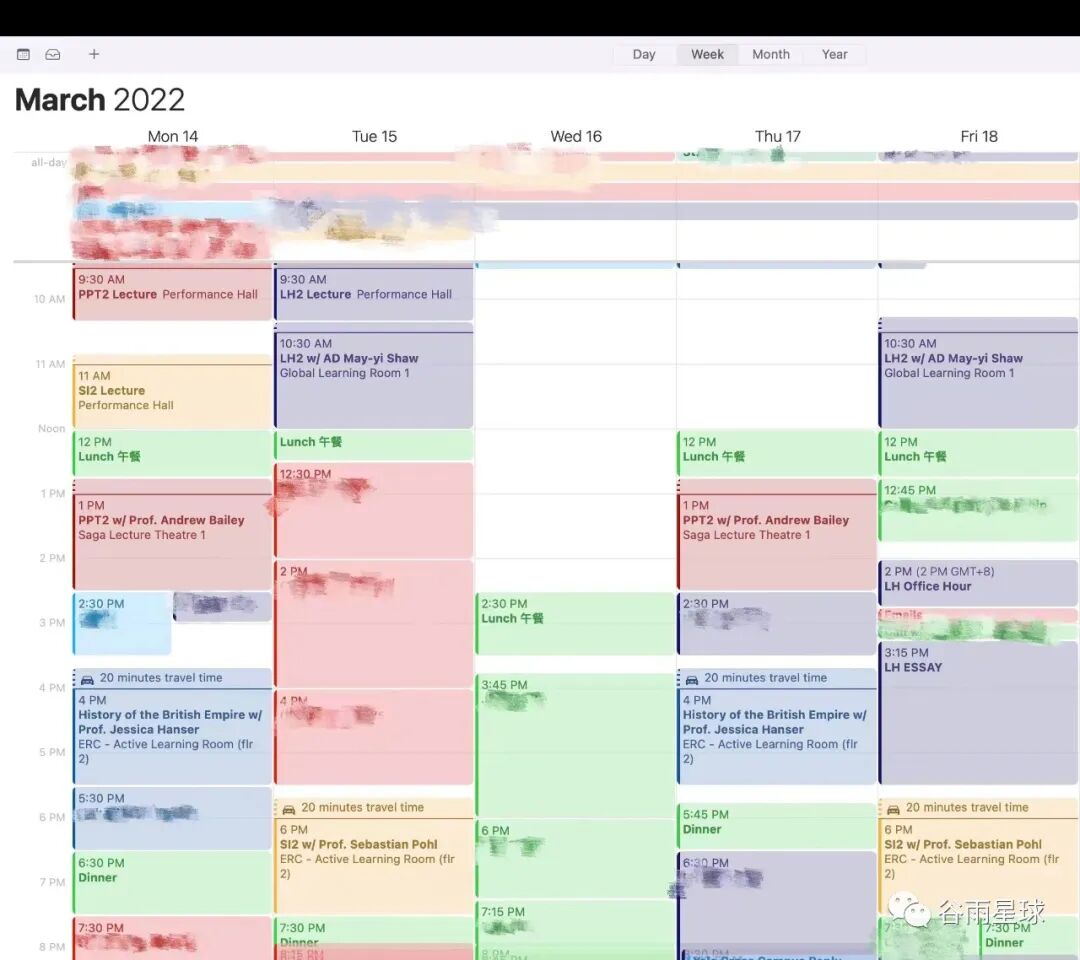 04 把坏事变成好事的能力耶鲁-新国大并没有让我失望,教授有藤校来的教授,也有华人背景大牛。同学背景也很好,非常多元。课程设置也采两者文化之长。拿哲学课程举例,西方哲学占全部哲学内容的三分之一左右,除了柏拉图、亚里士多德,也会研究孟子、庄子,除了笛卡尔和尼采,也会有王阳明、陈独秀等。▲课表,深红色代表哲学,深蓝色是文学,蓝色是历史,黄色是科学唯一让我有些遗憾的是,新加坡实在跟上海太像了,我曾经拍过一张新加坡的商场照片发给我朋友们,猜猜我在哪儿?几乎所有人都说,你是不是回上海了?更令人无奈的是,就在我刚刚适应没多久的时候,就传出项目关闭的消息。我和同学们成为了耶鲁-新国大最后一届学生。没想到吧,我的求学路不仅在中学阶段一波三折,在大学还能来个逆天大反转。我也在想,这种不确定性其实跟当下的大环境莫名产生了某种共鸣。在未来,我们很难再去拥有一劳永逸,或是永远正确的选择了。