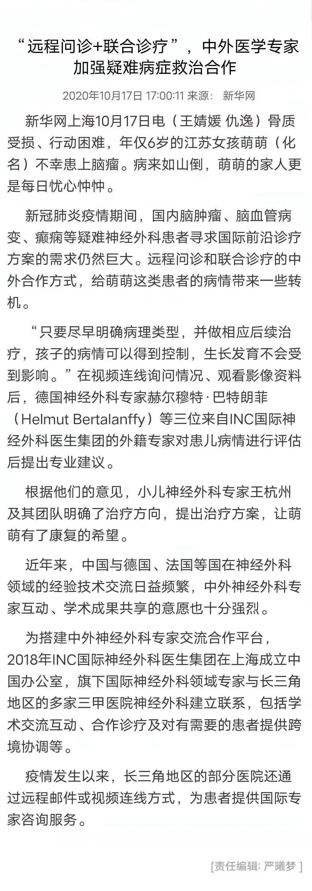 在INC的推动下,不出国门、远程“问诊”海外知名专家的方式备受青睐,INC旗下顾问团的多位世界神经外科大师与INC合作的国内三甲医院神外专家联合,通过互联网携手为疑难病症患者开展诊疗,挽救复杂脑肿瘤、脑血管病变患者的生命,提升其生活质量。INC攻克重重困难,打通海外医疗通道,将多名患者安全送往国外接受手术,他们之中不乏“被判死刑”的疑难脑瘤患者,在疫情肆虐之下重拾生的希望。INC出国手术案例之14岁女孩如何战胜视神经胶质瘤?