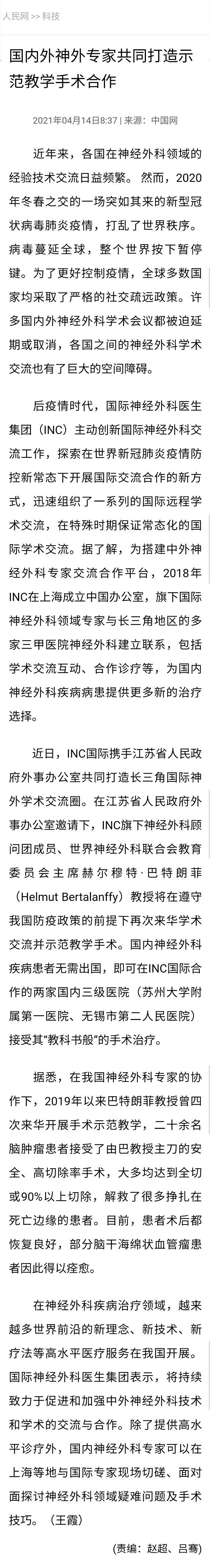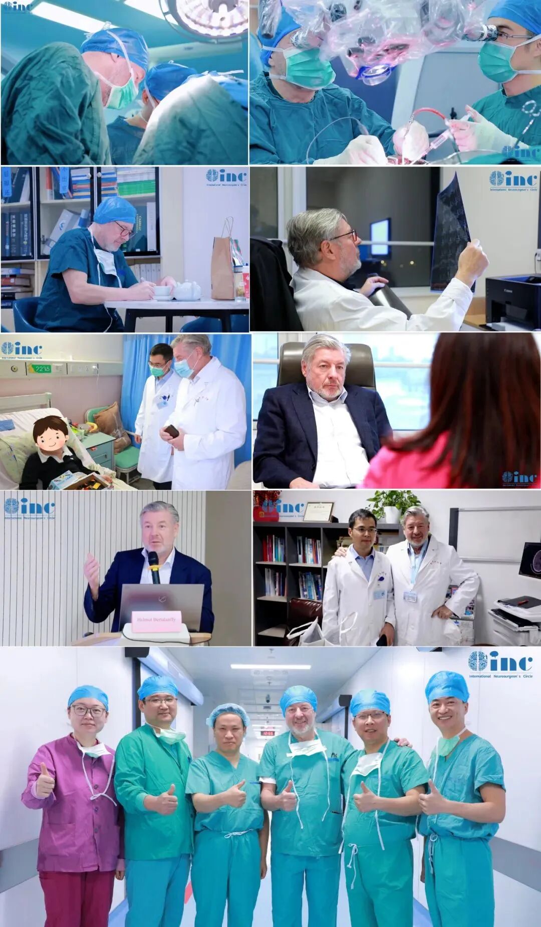 2021巴教授来华疑难手术示范掠影2022作为江苏省卫生支撑计划中德国际合作交流项目,INC国际神经外科医生集团旗下组织世界神经外科顾问团(WANG)成员、世界神经外科联合会WFNS教育委员会主席、德国INI国际神经学研究所Helmut Bertalanffy(汉莫特·巴特朗菲)教授受邀再次来华学术交流及疑难手术示范。在INC合作的国内三甲医院——苏州大学附属儿童医院及苏州独墅湖医院,巴特朗菲教授与国内专家同台示范手术,在救治疑难病症患者的同时,切磋手术技巧、学术交流讲学,推进中外神经外科之间的良性互动。