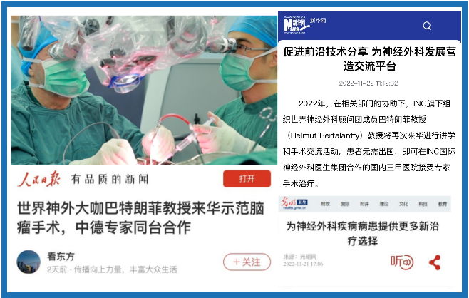 2021年5月,INC排除万难推进“中德国际项目交流”,巴特朗菲教授来华进行学术交流及疑难手术示范。在上海市疫情防控办、江苏省卫建委、江苏省疫情防控办等政府相关部门的大力协助下,INC德国巴特朗菲教授来华计划得以成行,此次医学交流和疑难示范手术期间,两国医学专家同台手术,在救治疑难病症患者的同时,促成了中外神经外科之间的正常互动。