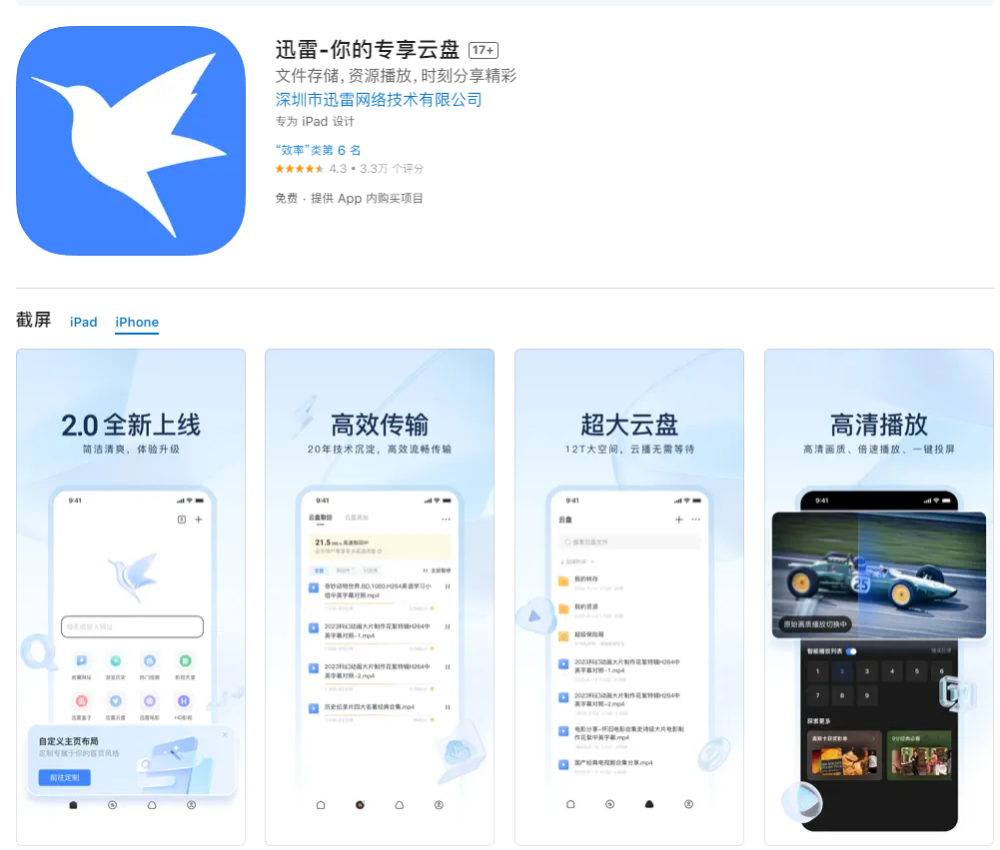 IT之家注意到,迅雷在 iOS 平台定位为云盘,专为 iPad 打造,需要 iOS / iPadOS 13 以上版本的设备才能使用。此外,迅雷还为用户提供了多种会员服务。