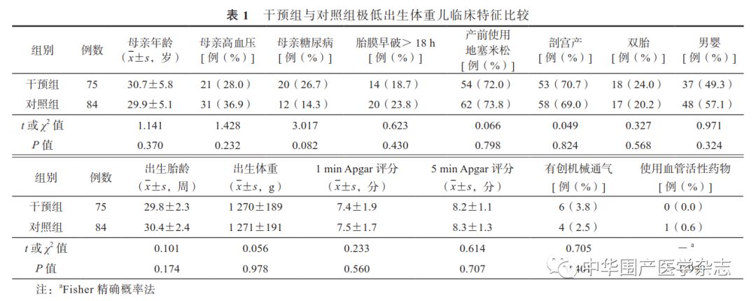 根据以上标准,2017年8月至2018年7月,共收治VLBWI 81例,其中2例合并先天畸形,4例放弃治疗,故干预组共纳入75例;2016年2月至2017年1月,共收治VLBWI 91例,其中3例合并先天畸形,3例放弃治疗而提前出院,1例家属要求转院,故对照组共纳入84例。本研究经本院伦理委员会审批通过(批号2017023)。