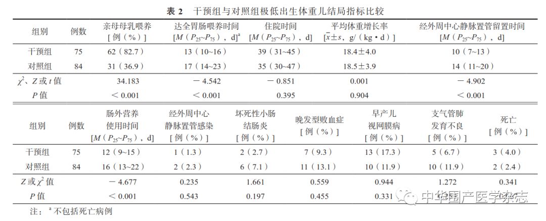 2. 2组主要结局和次要结局比较:与对照组比较,干预组亲母母乳喂养率较高,达全胃肠喂养时间、经外周中心静脉置管留置时间、肠外营养使用时间较短,差异均有统计学意义(P值均<0.001)。见表2。