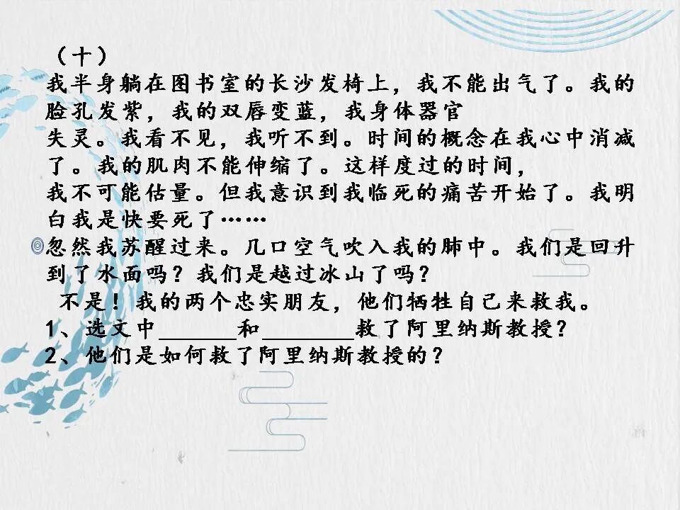 1.尼摩船长和阿龙纳斯在海底环球探险旅行时,经历了许多险情,请列举其中几次。
