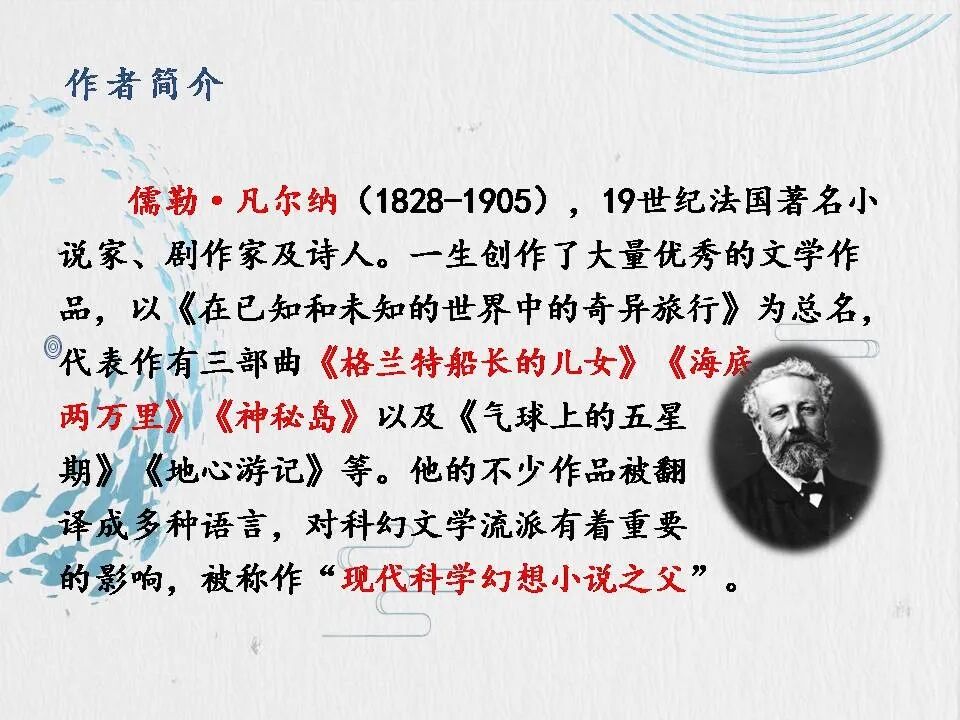 儒勒·凡尔纳:19世纪法国著名作家。生于海港城市南特,自幼喜欢航海,曾擅自离家做水手。1848年到巴黎学习法律,毕业后却去了剧院做秘书,写剧本,并热衷于各种科学的新发现。1863年,因出版《气球上的五星期》而一举成名,从此开始职业创作。他一生写有60多部科幻小说,大部分作品收录于总题为《在已知和未知的世界中的奇异漫游》的作品集。其中《格兰特船长的儿女》《海底两万里》和《神秘岛》被称为“凡尔纳三部曲”。他的作品对科幻文学流派有着重要的影响,他也因此被誉为“现代科学幻想小说之父”。