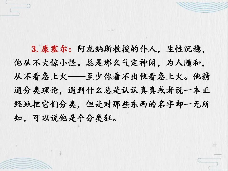 康赛尔:阿龙纳斯教授的仆人,生性沉稳,他从不大惊小怪。总是那么气定神闲,为人随和,从不着急上火——至少你看不出他着急上火。他精通分类理论,遇到什么总是认认真真或者说一本正经地把它们分类。