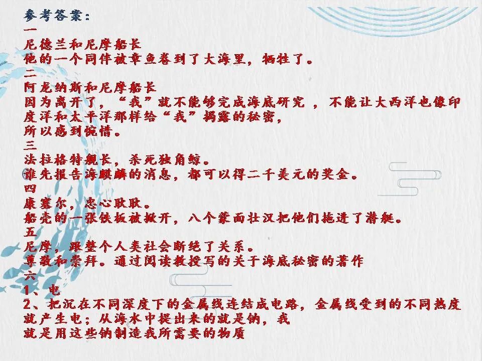 5.《海底两万里》中诺第留斯号潜艇是船长尼摩在大洋中的一座荒岛上秘密建造的,船身坚固,利用海洋发电。