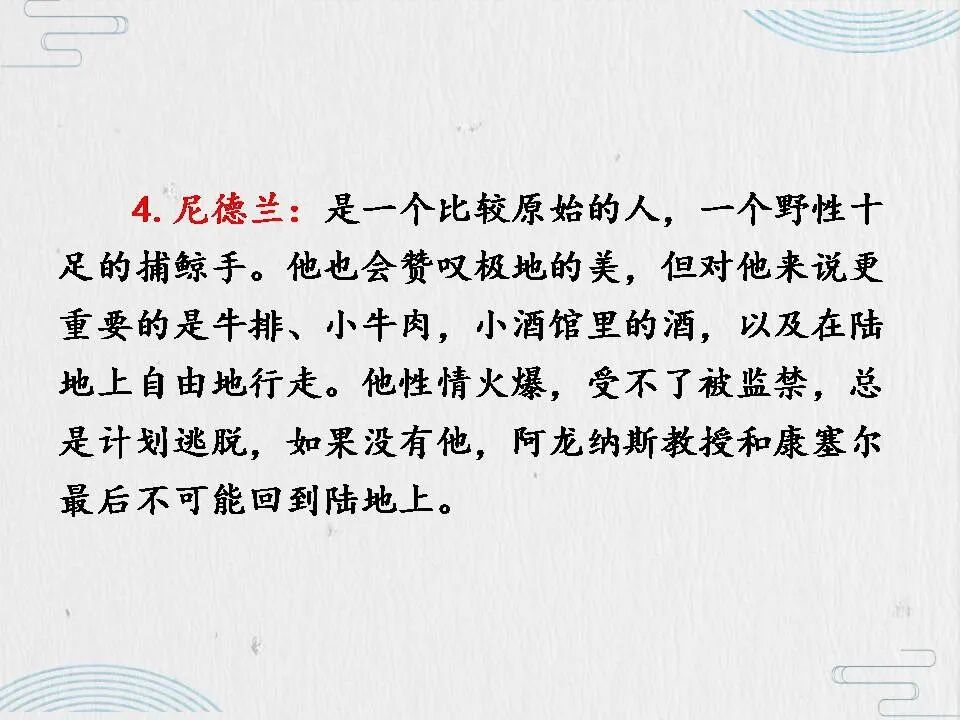 尼摩船长:这是一个带有人文主义和民主思想的典型的人物形象。在当时的历史条件下,他代表着新兴的资产阶级的利益。透过他的个性,可以看到处在上升阶段的资产阶级的代表人物那种自强不息的进取精神。他如大海一般兼具热情、冷酷、和善、危险、温和、暴躁、任性等性格特征。他是一个在反抗殖民主义斗争的烈火中成长起来的民族志士。他所渴望的不是金钱和财富,而是人生的自由和幸福。