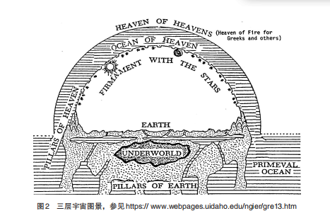 对于荷马的世界图景,研究者们普遍注意到了《伊利亚特》中对“阿喀琉斯之盾”的描述。在阿喀琉斯的母亲、海洋女神忒提斯的请求下,工匠神赫淮斯托斯为阿喀琉斯铸造了精美的盾牌。盾身有五层:第一层是大地、天空和大海,月亮和太阳,还有群星;第二层是两座城邦(和平之城与战争之城),代表人间的城市;第三层是犁耕的田野,劳作者正在收获的国王属地,还有一片种植葡萄的果园,代表农业;第四层是有牛群的牧地、有羊群的牧场和一座舞场,代表畜牧业和娱乐;第五层是水流磅礴的环形长河(或“大洋”,Oceanus,俄刻阿诺斯)。从中可以看到,荷马明显受到了平面圆形大地观念的影响—大地仿佛一个大圆盘,边界是环形长河(见图1)。同时,在荷马与赫西俄德的神话叙事中,宙斯与主要神祇居住在高于云层的奥林波斯山上,大地之下则是冥王哈迪斯的王国,再下面更深处是囚禁着提坦们的塔耳塔罗斯(Tartarus)。总体上,这构成了一幅想象中的三层宇宙(Three-Story Universe)图景,而人类生活在大地上(见图2)。对于荷马和赫西俄德而言,他们所熟知的实际地理区域主要是希腊本土、爱琴海和小亚细亚沿岸地区。荷马还了解埃及和利比亚等地的情况,但对更远的区域,他不是“根本不知道”,就是“入于幻想之境”。