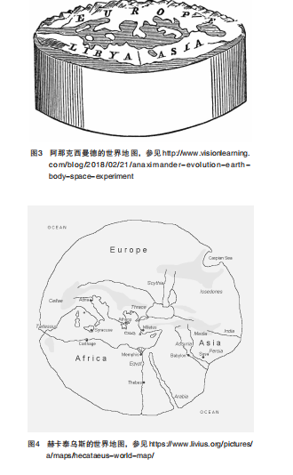 公元前6世纪是一个革新的时代。此时,希腊人已经通过大规模海外殖民运动在地中海和黑海沿岸建立了大量殖民城邦,熟悉的地理区域得到了扩大。而在小亚细亚沿岸的米利都学派重新思考万物的起源和宇宙的构成问题,奠定了古希腊人科学认知与哲学思维的基础。米利都的阿那克西曼德 (Anaximander of Miletus,约公元前610年—约前546年)被认为绘制了第一张世界地图。虽然这份地图失传了,但关于它的零星记载仍反映出它的基本特点:世界是圆柱形的,这个圆柱体的高度是其直径的三分之一,像一根石柱(在现代人看来也有点像蛋糕),圆柱的顶层是平面圆形的大地,人类居住在上面,长河环绕着大地。太阳、月亮和星星围绕着大地在轮状轨道中运行。大地的北部是欧罗巴、南部是亚细亚(包含着利比亚/阿非利加),德尔斐占据着大地中心的位置(见图3)。从中可以看出,阿那克西曼德的宇宙图景在一定程度上挑战了原先神话叙事中的世界观,但他仍然认为大地是平面圆形的,而其中心点是德尔斐。