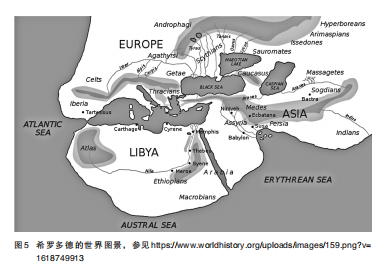 公元前5世纪,随着希腊人与波斯帝国爆发冲突与战争,他们所知世界的范围进一步扩大。希罗多德(约公元前484年—约前425年)记录下了希腊人和异邦人的“丰功伟绩”,他的世界图景无疑要比前人更加广阔、详细。虽然他坚持认为欧罗巴是三块大陆中最大的,“长度等于其他两地(指亚细亚和利比亚)之和”,在宽度上“比其他两地更是宽得无法相比”,但他也详 细地描述了亚细亚的“广袤”。他的出生地哈利卡纳索斯位于小亚细亚沿岸 (邻近米利都),一度被波斯人吞并和统治,这使他便于获悉波斯帝国的许多情况。由于他对亚细亚地理的认识丰富了不少,他的世界图景也向东“拉长”了(见图5)。因此,他才会嘲笑当时为数众多的平面圆形世界地图, “画得像圆规画的那样圆”是不合适的。他在历史叙事中仍延续希腊人的传 统,充分肯定德尔斐作为神托所的重要地位。但是,罗姆尼指出,希罗多德在介绍他的世界图景时将波斯人放在首位,波斯帝国的核心区域(苏萨、 波斯波利斯等)占据了人居世界(oikoumenē)的中央,希腊却被置于这个世界的“边缘”。这对以德尔斐为中心的希腊传统世界观提出了挑战。或许罗姆尼对希罗多德地理观念的解读值得再探讨。但无论如何,庞大的波斯帝国会迫使许多希腊人“重新绘制自己的心理地图”。