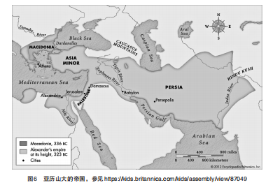 值得注意的是,虽然亚历山大热爱并积极推广希腊文化,但他并不将自己帝国的中心局限在希腊或马其顿。作为当时东、西方大致的中间点,巴比伦具备成为新的“世界中心”、进而统合整个帝国的可能性(见图6)。但这 一切随着亚历山大的早逝而旋即改变。