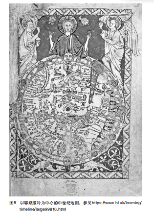 但到了古代晚期,随着基督教取代古代信仰,耶路撒冷作为“上帝之城”被确认为新的世界中心(见图8)。而罗马作为“地上之城”则终将灭亡,其他的异教文化和学术中心也几乎都遭受了打击。4世纪末,狄奥多西一世下令禁止对德尔斐和奥林匹亚的崇拜。529年,查士丁尼一世关闭了雅典的阿卡德米学园。在这一过程中,希腊人的世界观亦发生重大变化,耶路撒冷终于成为他们信仰上的世界中心。希腊人走入了中世纪。