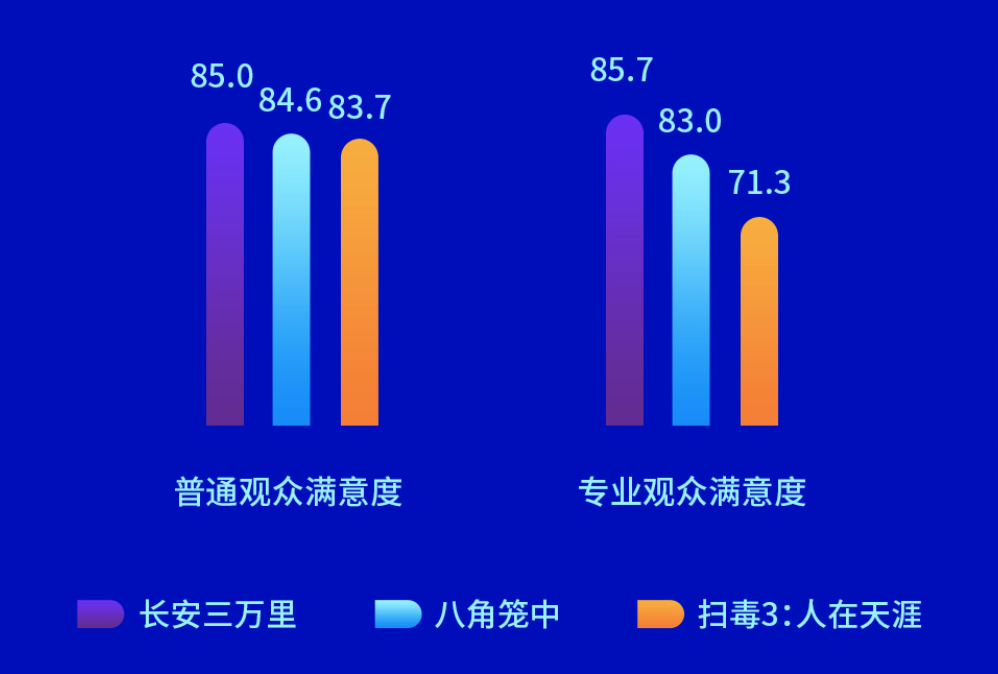 在不同观众评价上,《长安三万里》普通观众得分85.0分、专业观众得分85.7分,在三部影片中均为最高,同时也居2023年5月以来调查8部影片的第一位,《八角笼中》均居第三位。其中,《长安三万里》也是2021年以来唯一一部专业观众满意度高于普通观众的影片,可见专业观众对其电影艺术创作给出了高度赞誉。