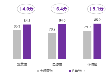 从细分维度来看,在专业观众评价中,《长安三万里》在12项指标中的10项得分均为最高,其中传播方式得分100分,健康积极的价值观念、视觉效果、创意新颖度得分均超86分。《八角笼中》的思想情感的深广度、主要演员的表演得分最高。