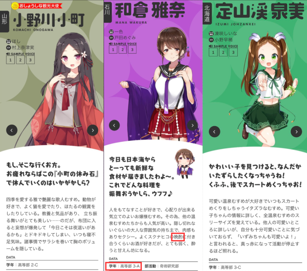就在「定山溪泉美」「和仓雅奈」和「小早川小町」这三个角色的设定中,出现了喜好「掀裙子」「晚酌」以及「夜爬」这样的词语。如果说「掀裙子」还能说只属于恶趣味,那结合这些角色初中生的设定,这些描写毫无疑问是在挑战到了法律与伦理。