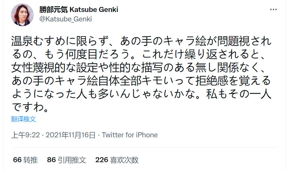“不只是温泉娘,而是二次元人物都令人恶心。”