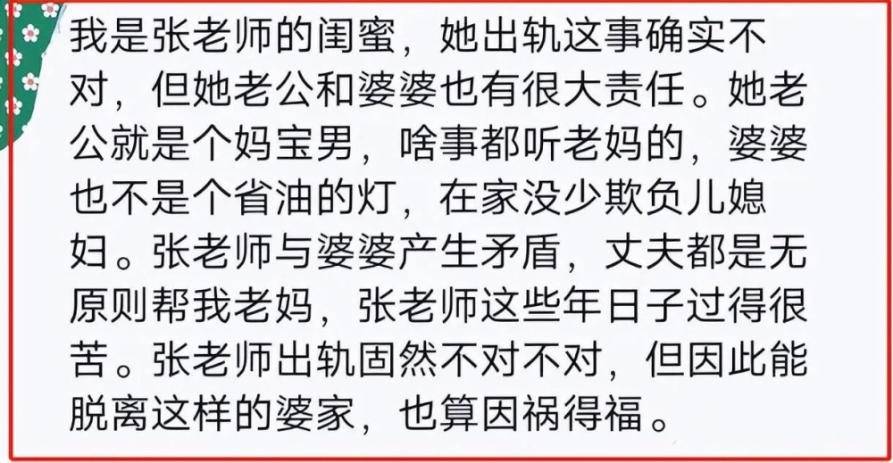 没想到,张女士出轨一事原来还有这样的内情,张女士的丈夫是妈宝男,婆婆欺负她,家庭生活不幸福,但这些都不是她出轨的理由,闺蜜所述价值观也明显不对。
