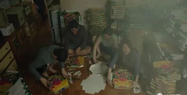 这样说起来,一家四口都是无业游民,靠给披萨店折纸盒为生,这天外面正在喷洒灭虫药,女儿想把窗户关上,不知道能不能称为窗户,因为看起来更像是街道下水的排水口,父亲却说家里也有蟑螂,开着窗户就能蹭点药,哎,这是把自家人也都当成了蟑螂,随即全家便被淹没在了灭虫药里,难以呼吸,父亲却像没有闻到一样,沉浸在折纸盒中。