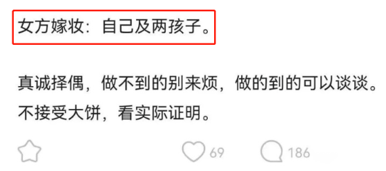 “真诚择偶,做不到的别来烦,做得到的可以谈谈。不接受大饼,看实际证明。”