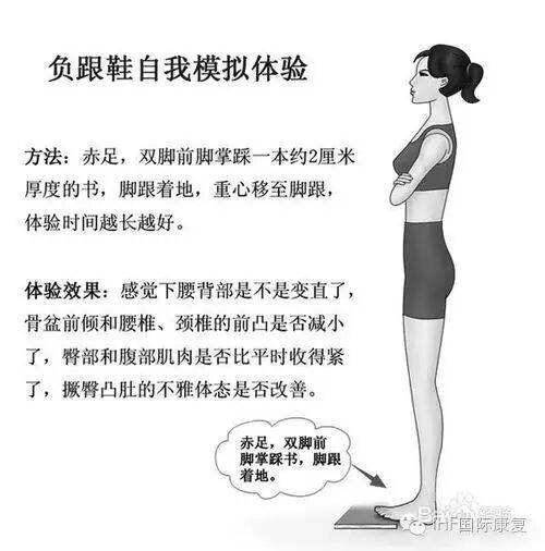 负跟鞋自我模拟试验:双脚并拢赤足站立,前脚踩一本20毫米厚度的书,感觉一下脊柱是否挺拔了,腰部是否直起来了?