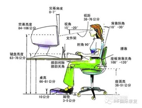 正确的坐姿应该是上半身保持颈部直立,使头部获得支撑,两肩自然下垂,上臂贴近身体,手肘弯曲呈90度,操作键盘或滑鼠,尽量使手腕保持水平姿势,手掌中线与前臂中线 应保持一直线。下半身腰部挺直,膝盖自然弯曲呈90度,并维持双脚着地的坐姿。避免久坐,每坐1小时就起身活动一会儿。