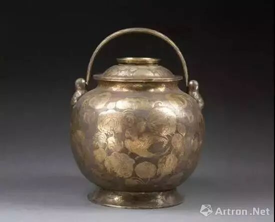 唐 鎏金鹦鹉纹提梁银罐